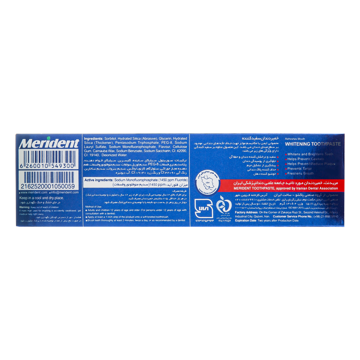 ترکیبات : سوربیتول، سیلیکای ساینده، گلیسرین، سیلیکای قوام دهنده، پنتا سدیم تری فسفات. 8-PEG. سدیم لوریل سولفات، سدیم متوقلونور و فسفات، طعم دهنده مجاز خوراکی، سلولز گام، کارنوبا واکس، سدیم بنزوات، سدیم ساخارین، رنگ آبی ۴۲۰۹۰cl: و رنگ زرد ۱۹۱۴۰ CL:، آب دیونیزه