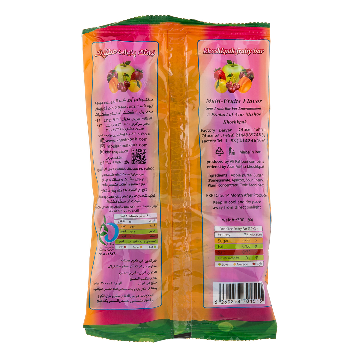 ترکیبات : پوره سیب، شکر، کنسانتره(انار،زردآلو،آلبالو،آلو)اسید سیتریک، نمک تصفیه شده خوراکی.