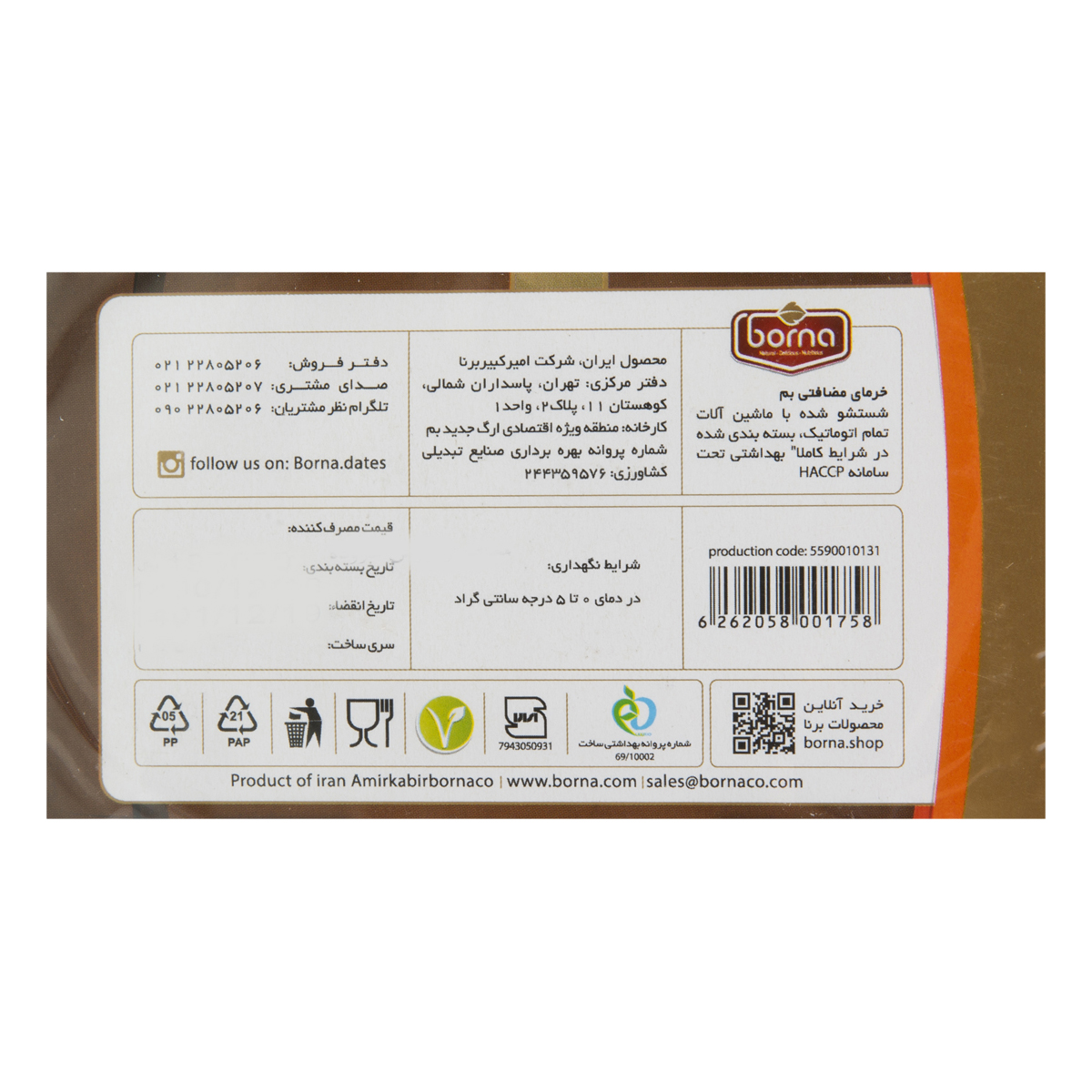 شرکت امیرکبیر برنا درزمینهٔ تولید و بسته‌بندی محصولاتی مانند خرما، خشکبار و میوه‌جات خشک فعالیت دارد. تمام انواع محصول خرم و خشکبار در فرایندی کاملاً بهداشتی و سالم بدون افزودن هرگونه ماده شیمیائی فراوری و بسته‌بندی می‌شود و در کارخانه شرکت برنا در قلب نخلستان‌های بم است و تمام محصولات کاملاً بهداشتی شسته و ضدعفونی می‌شوند.