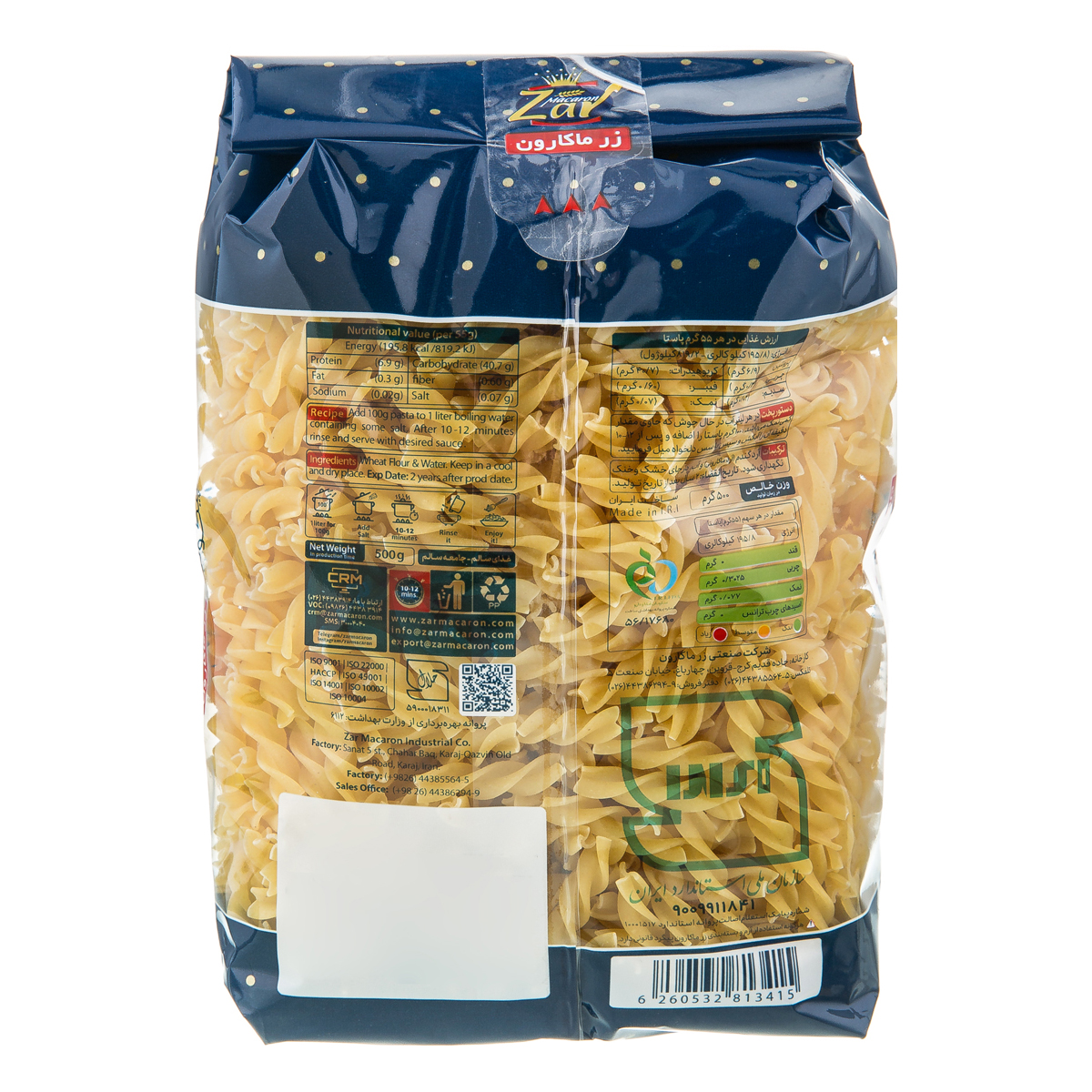 دستور پخت : در هر لیتر آب در حال جوش که حاوی مقدار کمی نمک می باشد،100 گرم پاستا را اضافه و پس از 10 تا  12 دقیقه آن را آبکش و سپس با سس دلخواه میل فرمایید.