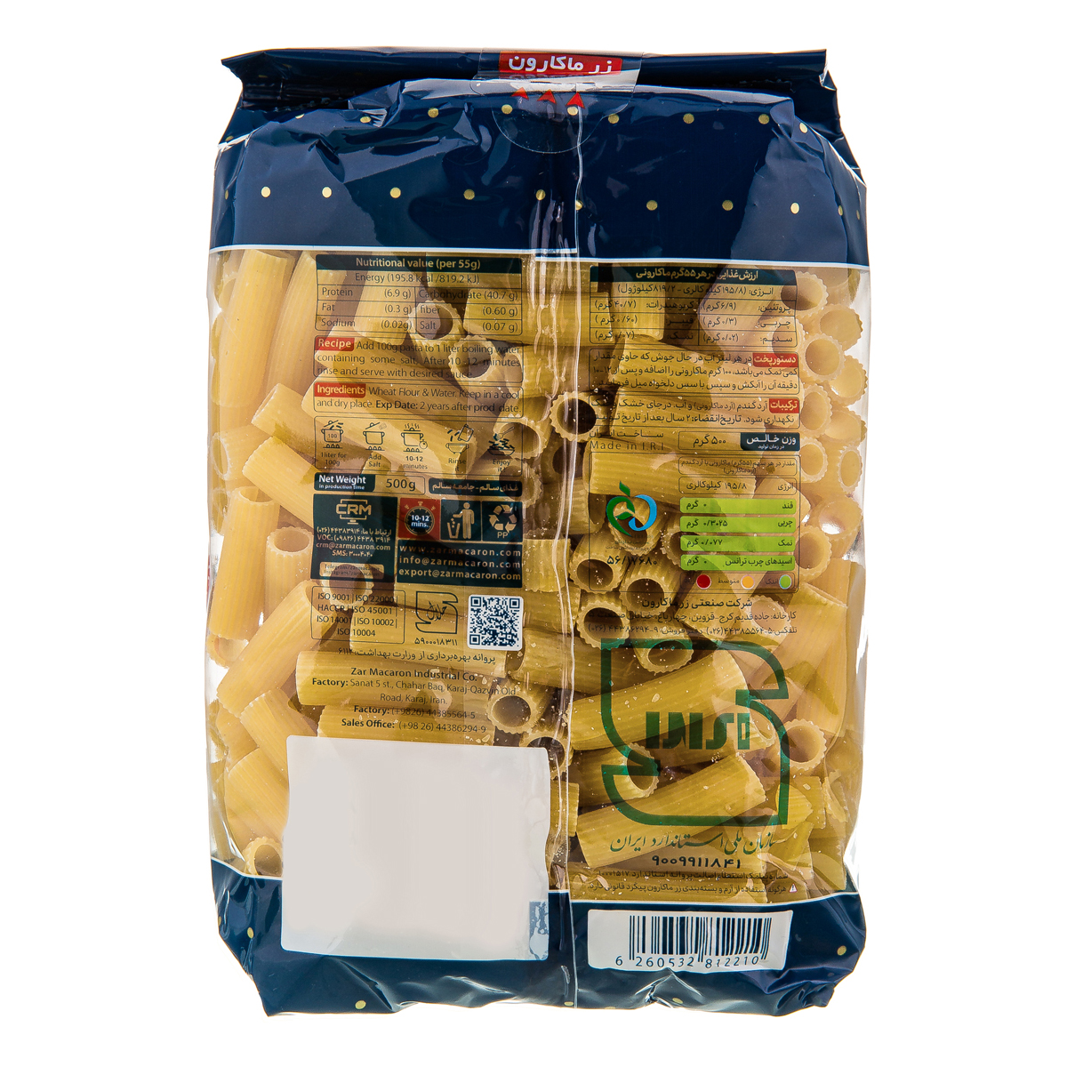 دستور پخت : در هر لیتر آب در حال جوش که حاوی مقدار کمی نمک می باشد،100 گرم ماکارونی را اضافه و پس از 10 تا  12 دقیقه آن را آبکش و سپس با سس دلخواه میل فرمایید.