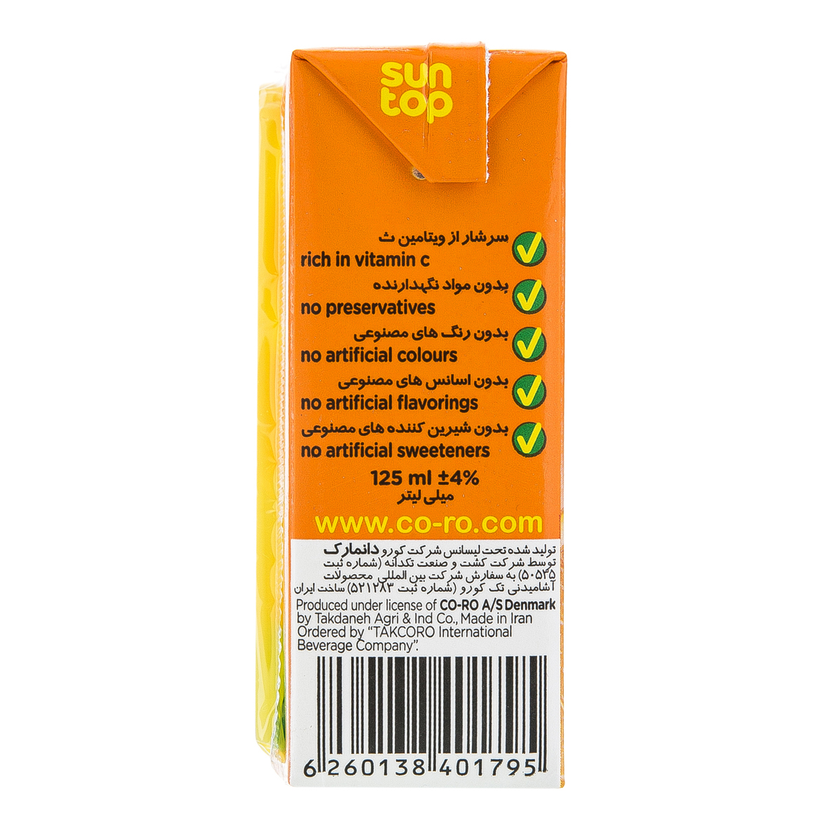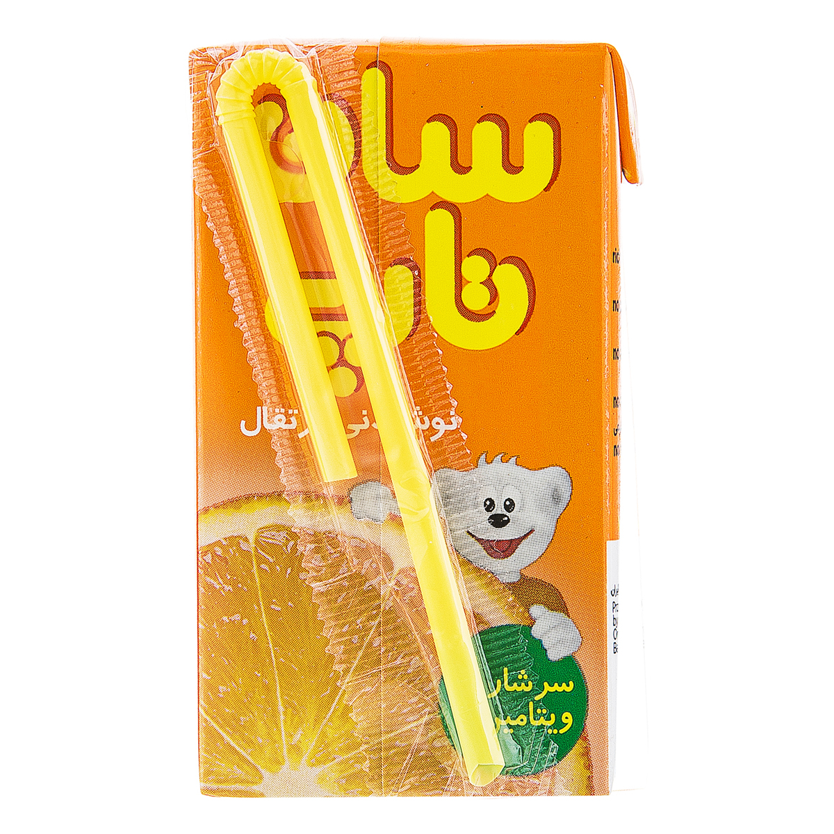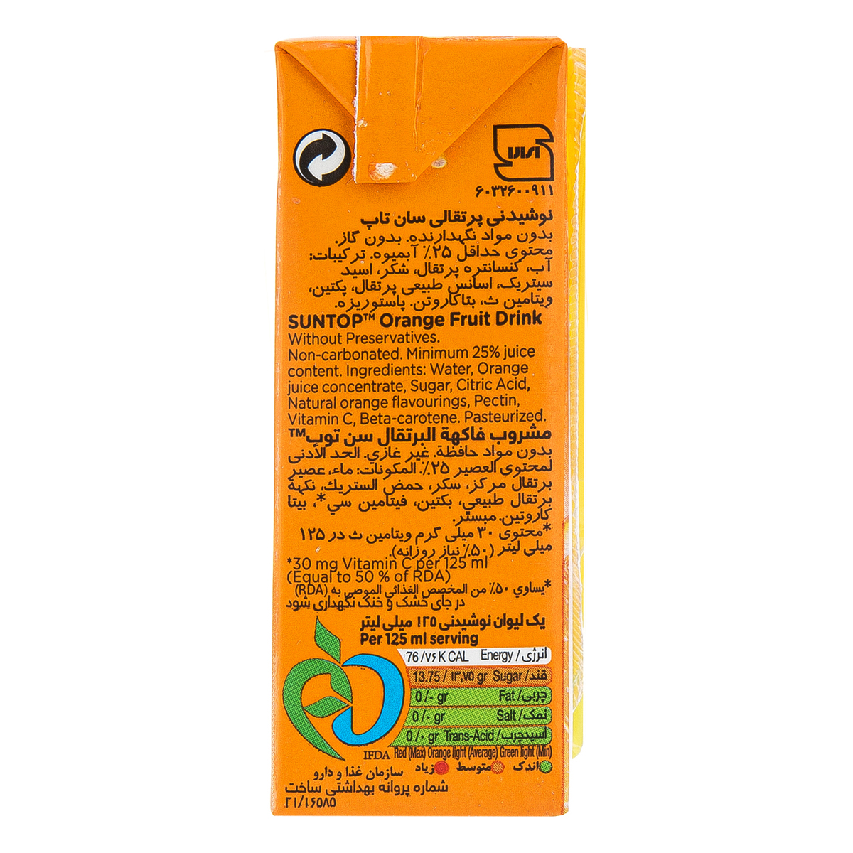ترکیبات : آب، کنسانتره پرتقال، شکر،اسید سیتریک، اسانس طبیعی پرتقال، پکتین، ویتامین ث، بتاکاروتن. پاستوریزه.